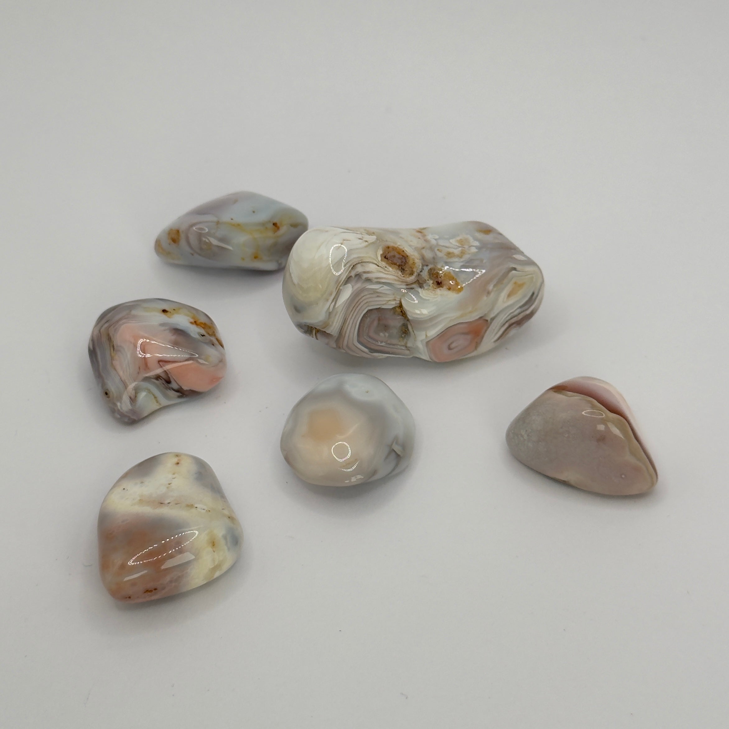On an emotional level, pink Botswana agate is a stone of deep emotional healing. She works gently to help release suppressed emotions and traumas, encouraging self-acceptance and inner peace. Her nurturing energy supports those going through emotional upheavals, offering comfort and protection. Pink Botswana agate is particularly effective in helping to overcome feelings of loneliness or heartache, fostering a sense of belonging and emotional resilience. Her energy promotes patience and calm, allowing for emotional processing and healing at a gentle pace. Pink Botswana agate is a stone of comfort, protection, and emotional healing. Her gentle energy makes her an ideal companion for those navigating periods of grief or emotional distress. She brings a sense of calm and reassurance. The soft pink tones of the stone symbolize universal love and nurturing, while her banding speaks to life’s cyclical nature—providing grounding during times of change.