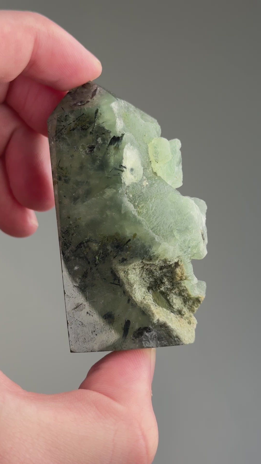 A stunning half polished, half raw prehnite tower with gorgeous 'bubbling' on the raw edge and fascinating, other worldly inclusions.
