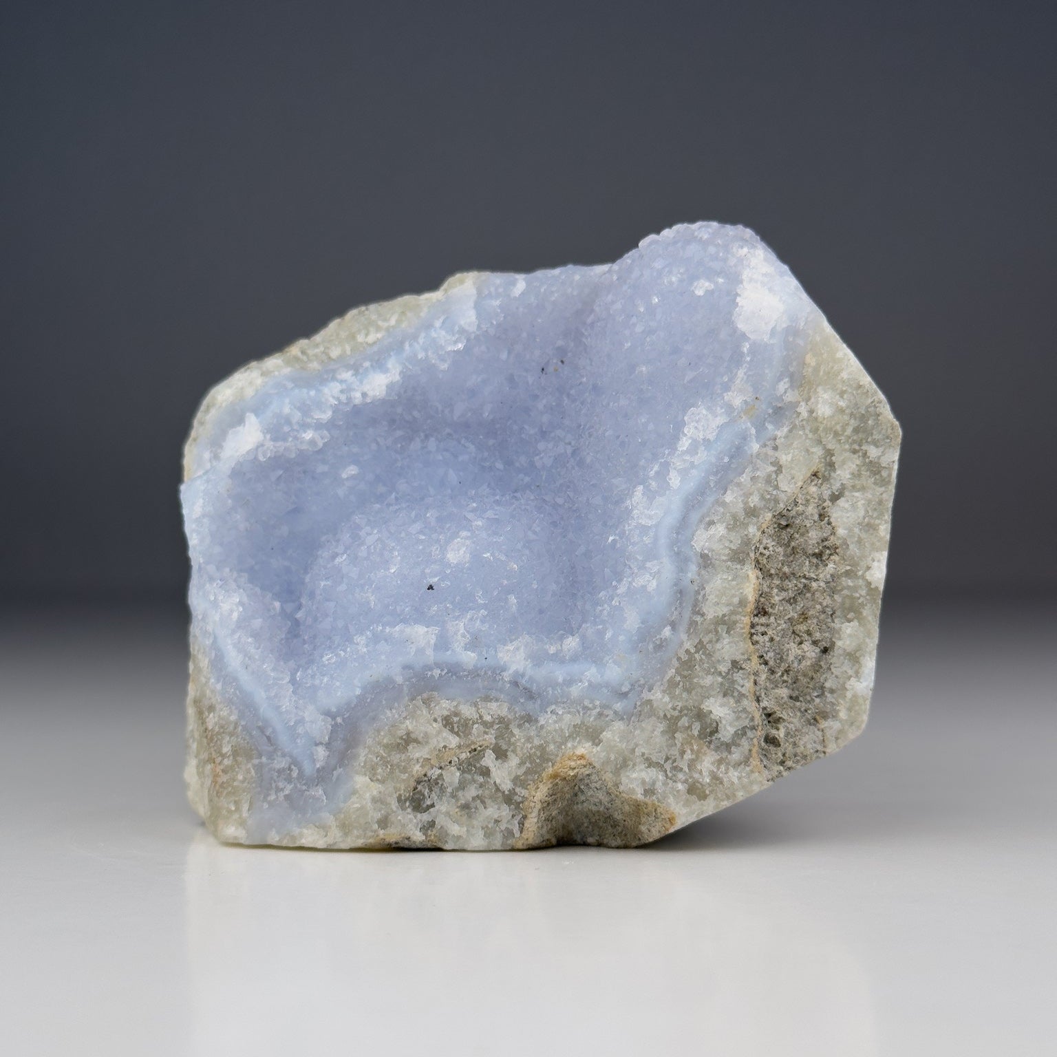 Blue Lace Agate is a gentle, calming crystal with soft blue hues patterned by delicate white bands that resemble lace, giving her a soothing and graceful appearance. She is part of the agate family, a variety of chalcedony, and is found in places such as the USA, India, Morocco, Brazil, the Czech Republic and Africa. With a hardness of around 6 on the Mohs scale she is durable enough to be shaped into jewellery or carried daily, yet she retains a sense of delicacy in her colouring. Her peaceful look reflects the calm energy she is known to bring.