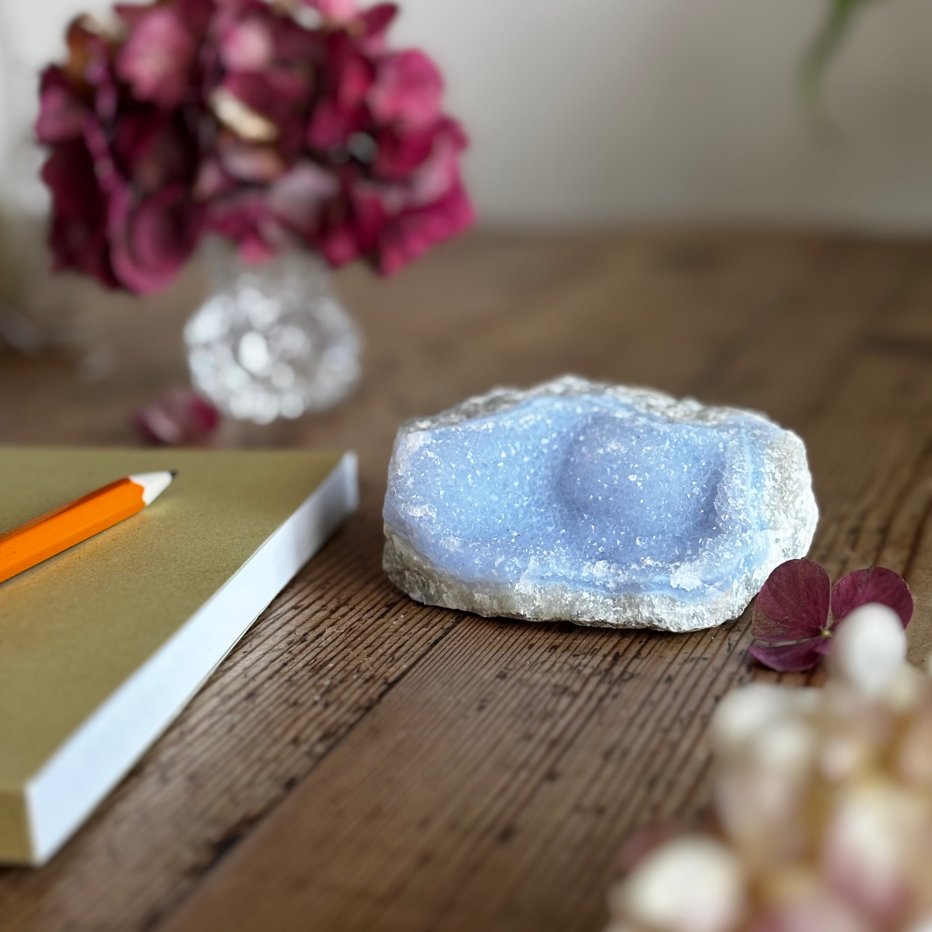Spiritually, Blue Lace Agate is considered a stone of communication and higher connection. She is said to open the throat chakra, allowing truth to be spoken with clarity and kindness, while also linking to the heart, third eye and crown chakras for a flow of higher energies. She helps align spiritual truth with personal expression and enhances sound healing practices by focusing vibrations to where they are most needed. Her presence is gentle but powerful, creating harmony and uplifting energy on both spiritual and earthly levels.