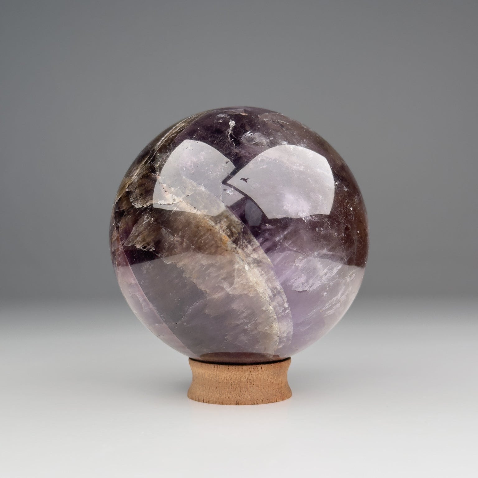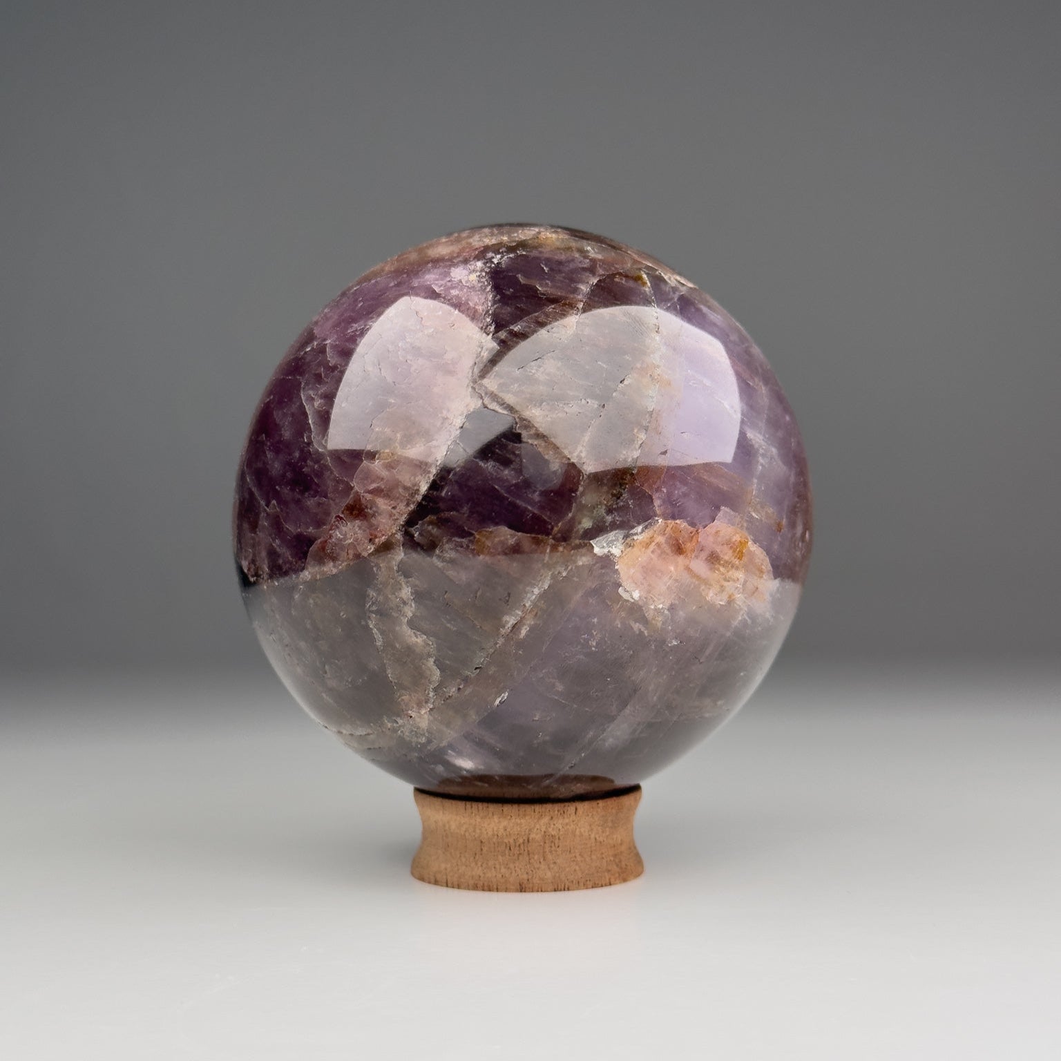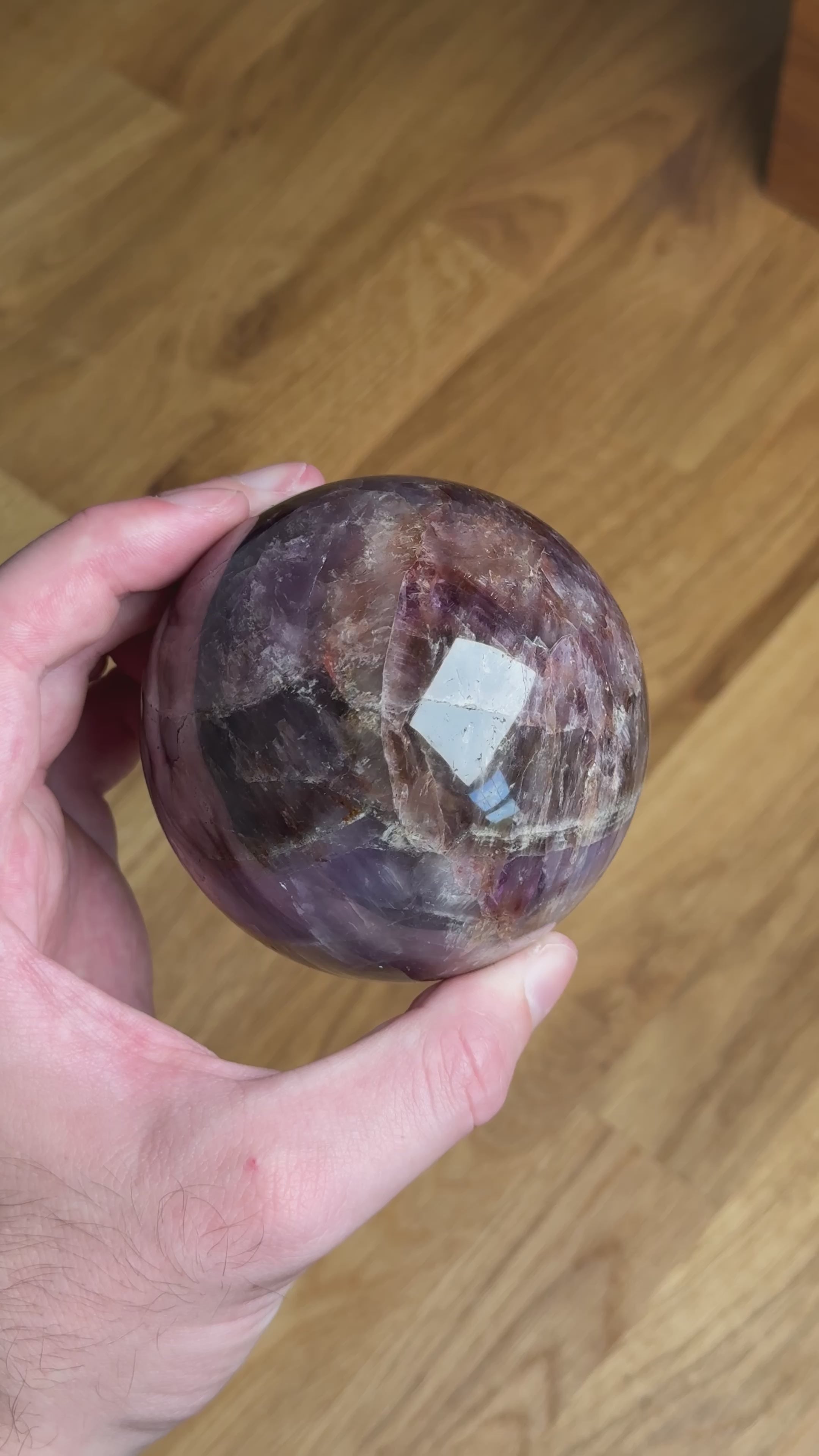 This stunning sphere showcases deep purples, smokey greys and golden hues, reflecting the wide variety of minerals she contains. Explore the cosmos as you gaze into her endless depths.