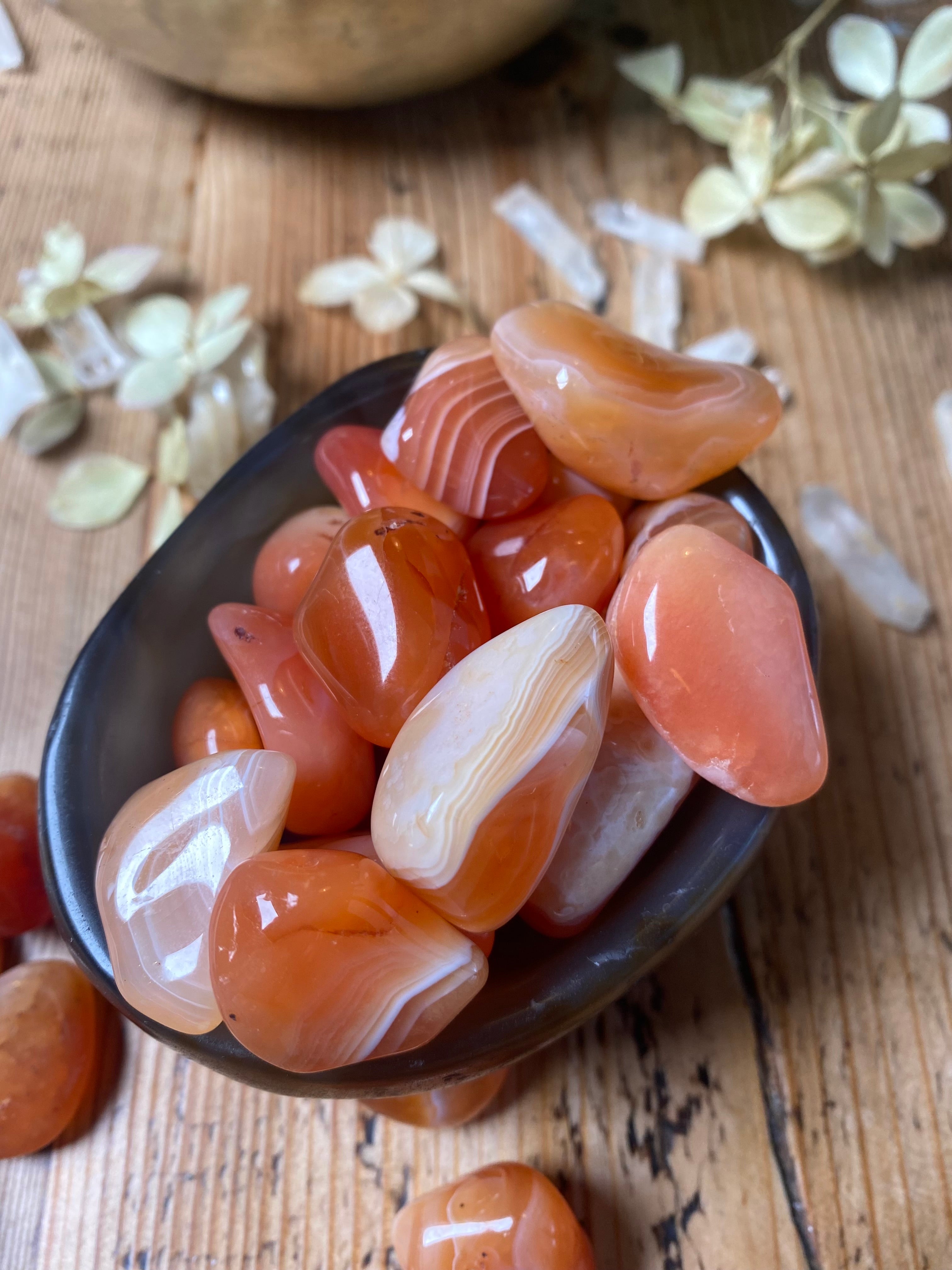 Dazzling, candy coloured carnelian banded agate tumbles. Some plain and glass-like, some displaying mesmerising swirls and layers of creams, pinks, oranges and reds.