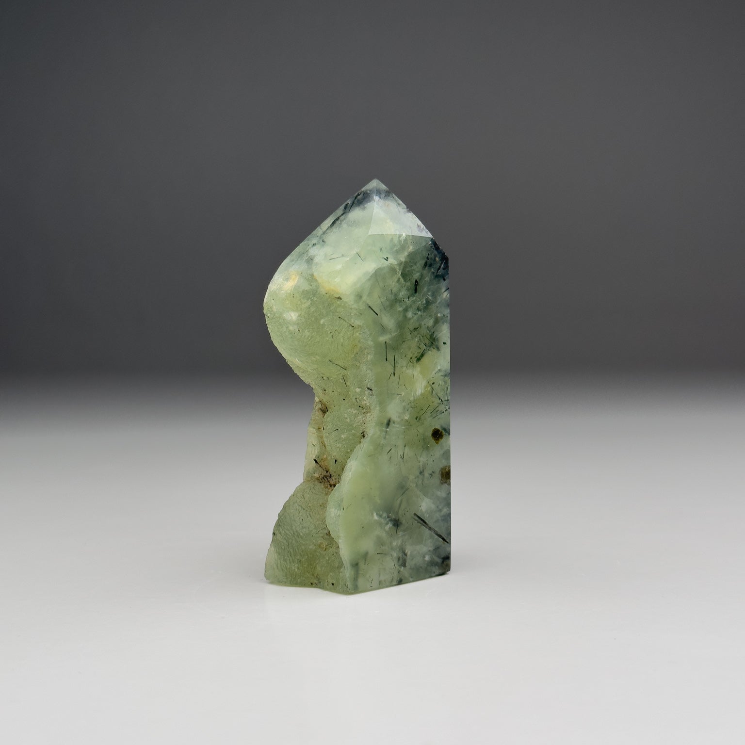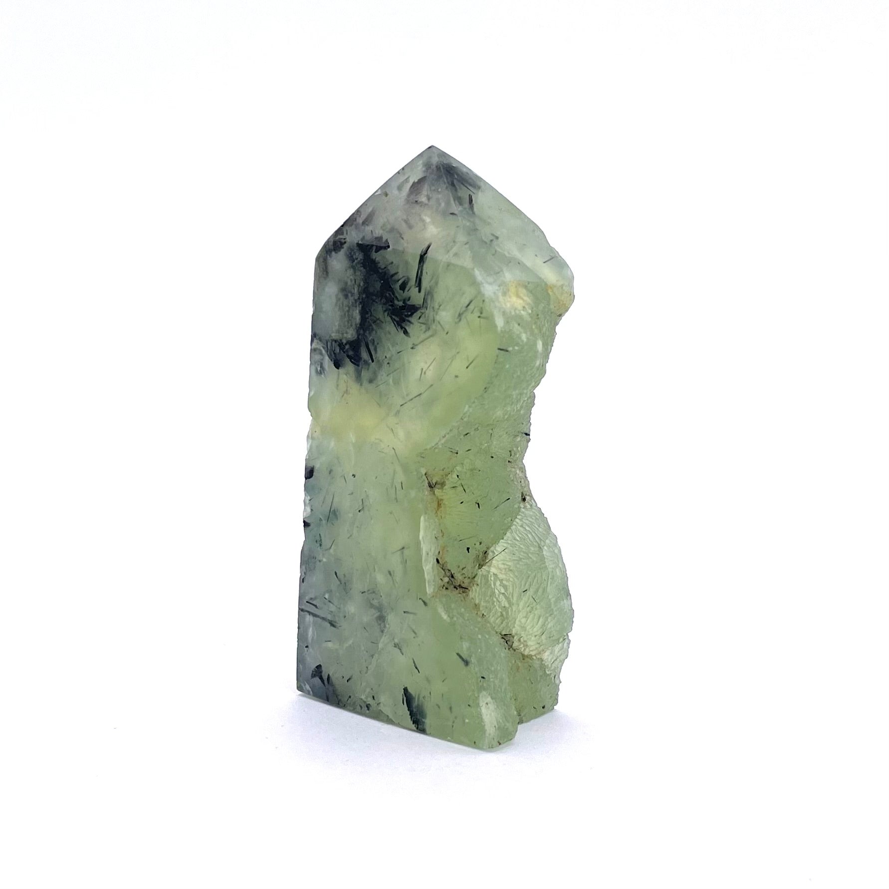 A stunning half polished, half raw prehnite tower with beautiful, light-to-dark inclusions.