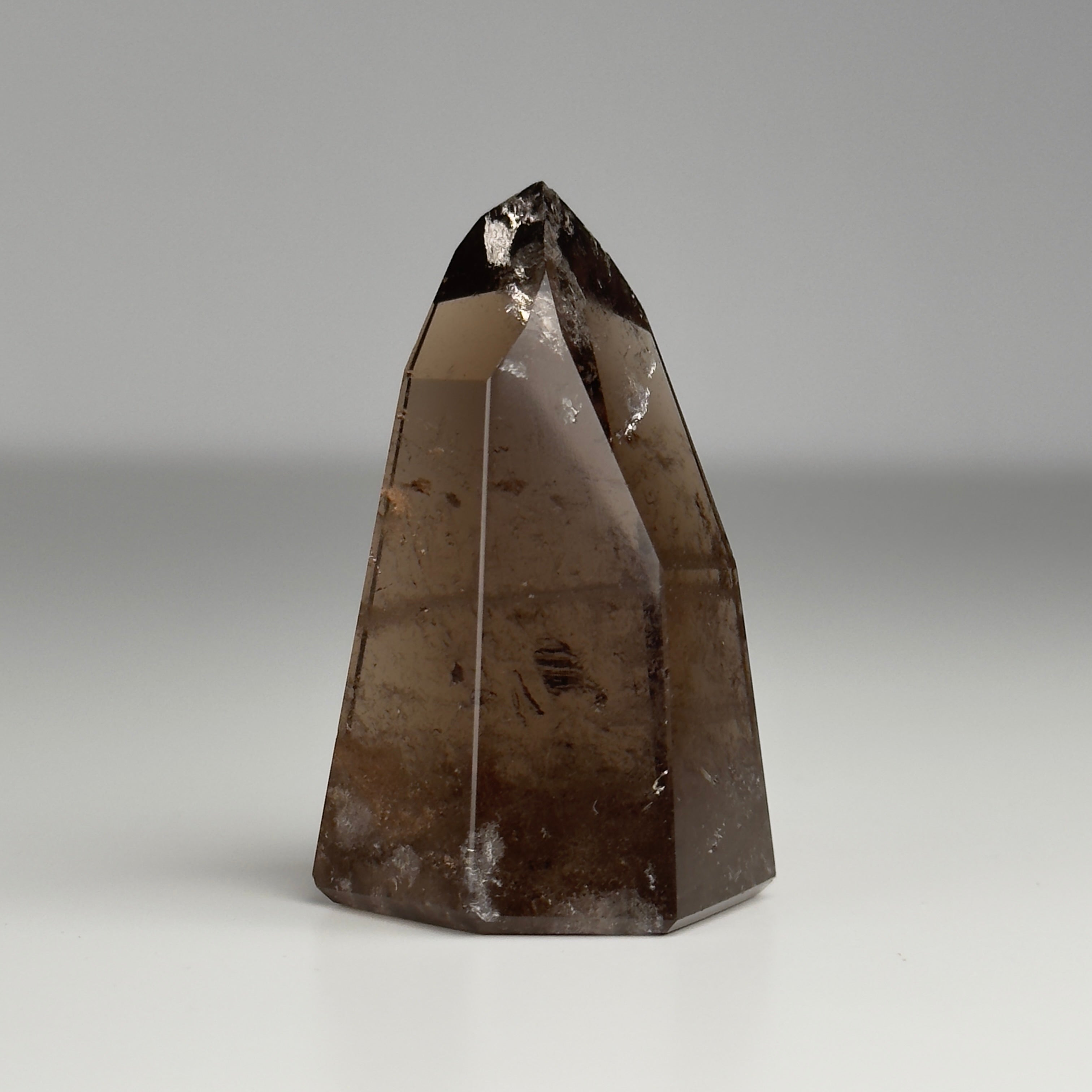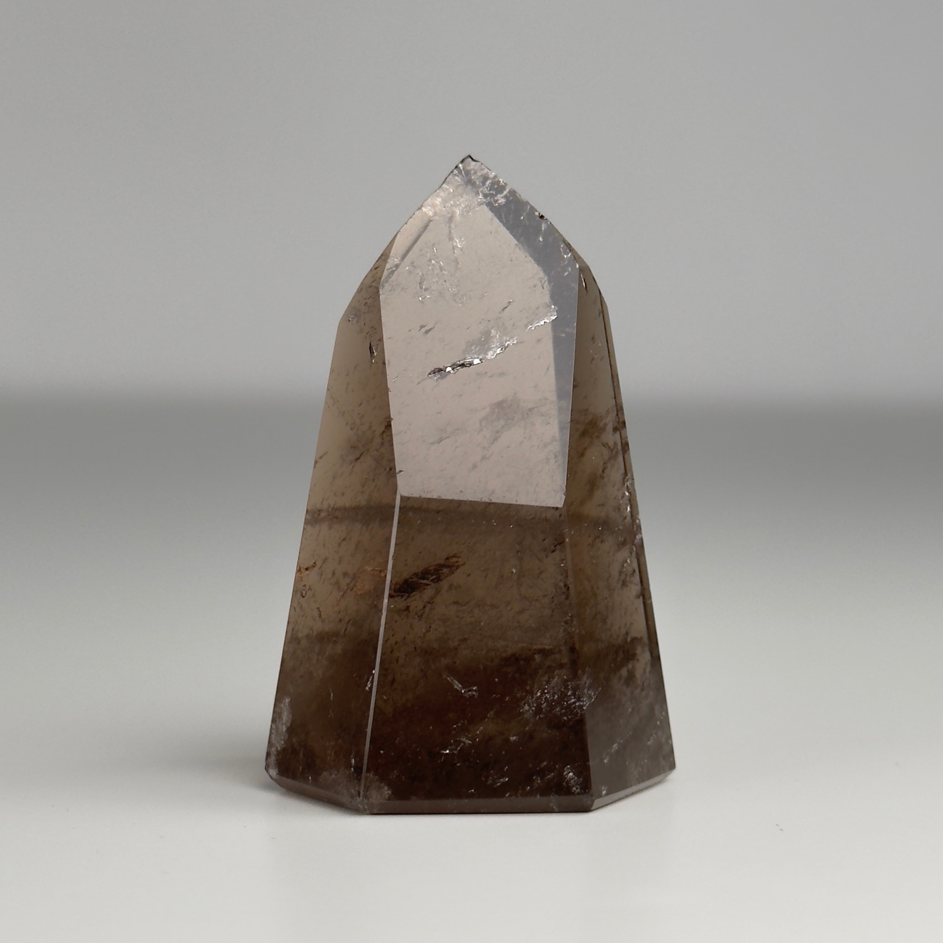 Smoky quartz is a graceful member of the quartz family, easily recognised by her soft, smoky colouring that ranges from gentle grey-brown to the deepest near-black. Her distinctive hue is created when natural radiation interacts with traces of aluminium within her structure. With a hardness of 7 on the Mohs scale, she is both resilient and enduring, often forming as elegant six-sided prisms with a luminous sheen. She has been treasured for centuries, especially in the Cairngorm Mountains of Scotland, while equally beautiful crystals are found in Brazil, Madagascar, and the Swiss Alps.